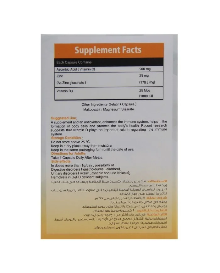 Vitamin C (Ascorbic Acid): 500 mg, Zinc: 25 mg, Vitamin D3: 25 micrograms