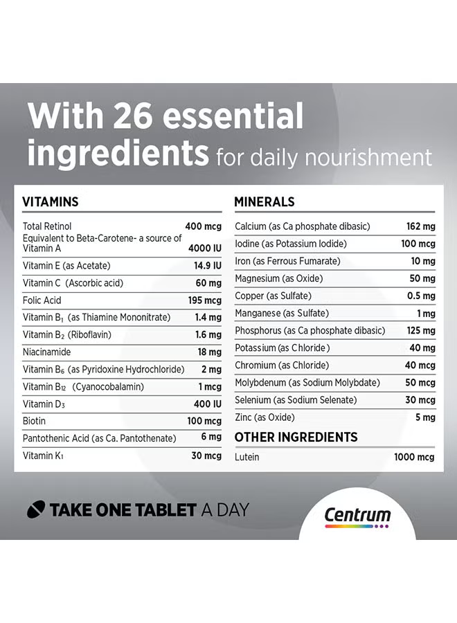 CENTRUM SILVER Adult 50+ is a specially formulated multivitamin designed for adults aged 50 and above. Each tablet contains essential vitamins and minerals to support overall health, including higher levels of Vitamin D3. This supplement helps maintain energy levels, immune function, and bone health.